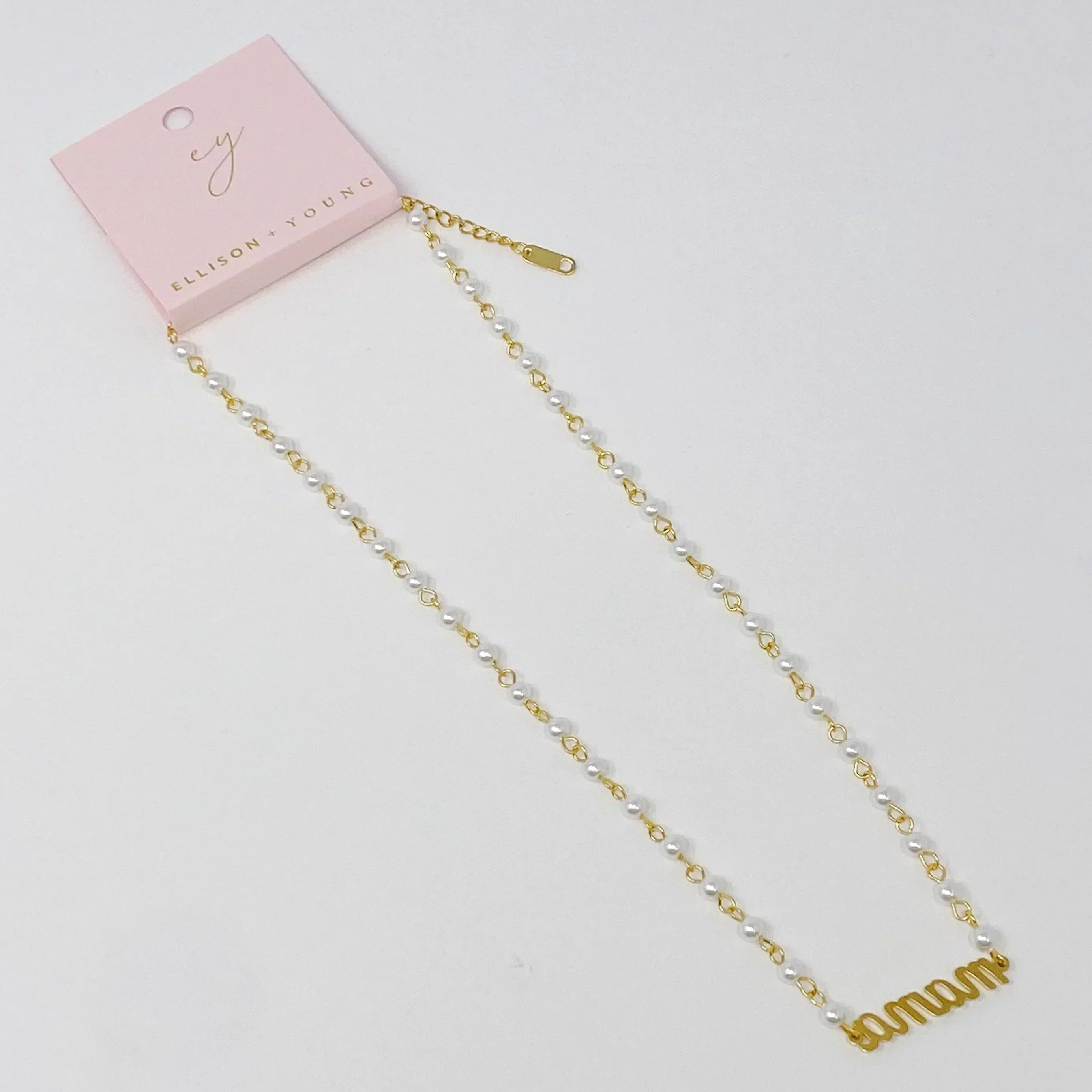 This Mama Pearl Chain Necklace features a beautiful pearl chain with a scripted MAMA cutout pendant, making it the perfect accessory for stylish moms. The elegant design works great as a statement piece on its own, or layered with other necklaces. Gift your mom with an elegant accessory she will love.